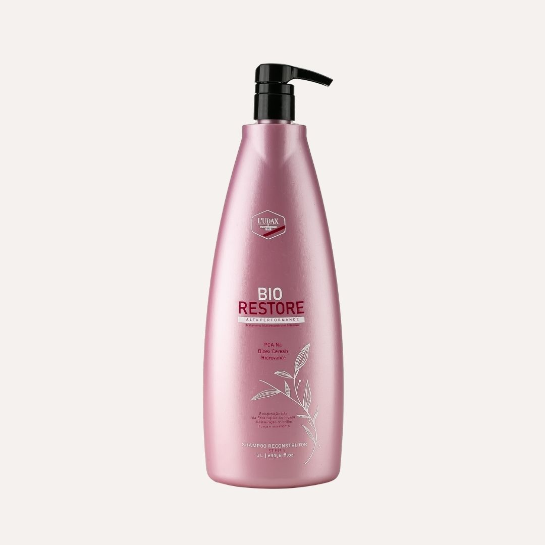 O Shampoo Reconstrutor Bio Restore da L’udax Professional limpa intensivamente os fios enquanto reconstrói e recupera a fibra capilar danificada por processos químicos, deixando os fios mais leves, macios e com brilho.